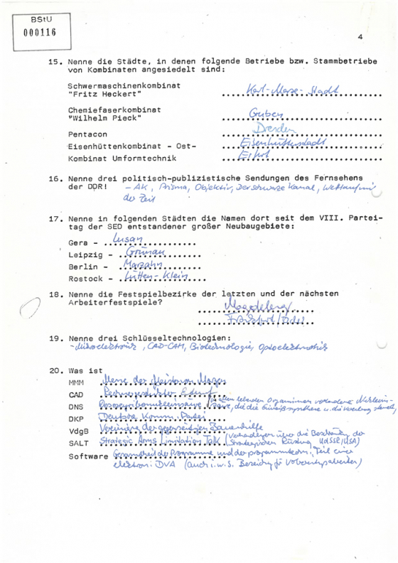 Bild-InfoTest zur Überprüfung von allgemeinen und speziellen politischen Bildungsvoraussetzungen zukünftiger Studenten der Jugendhochschule „Wilhelm Pieck“, 1980er Jahre; Quelle: BStU, MfS, SED-KL 3607.