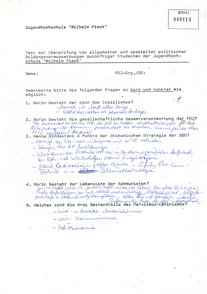 Vor Schulantritt wurden die Mitglieder der FDJ auf ihre ideologische Überzeugung sowie ihr Wissen über historische Ereignisse und die Tagespolitik geprüft.